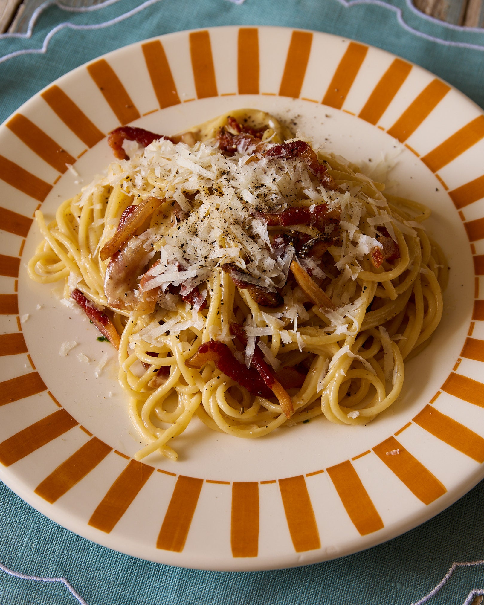Add a splash of reserved cooking water, then pour in the egg and Parmesan mixture. Toss quickly, the residual heat will gently cook the eggs into a glossy sauce. Add more pasta water if needed.